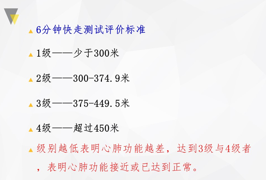 针对缺乏运动、疾病或者老年人群,心肺适能可采用6min快走试验进行测试。受试者尽力快走(不是跑),出现不适时可以减速、休息或者停止,记录6分钟内所走过的最大距离。